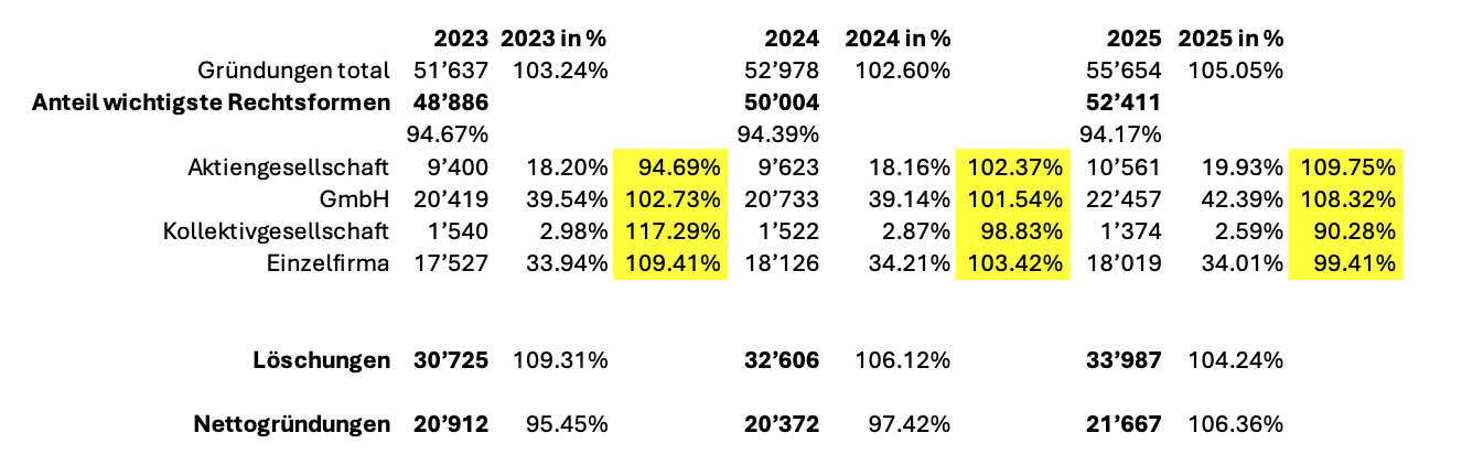 Die Schweiz verzeichnete 2025 erneut ein Gründungsjahr auf Rekordniveau: 55’654 neue Unternehmen wurden ins Handelsregister eingetragen. Damit wurde das bisherige Allzeithoch aus dem Vorjahr nochmals übertroffen. Zugleich wurden 33’987 Firmen gelöscht, sodass unter dem Strich 21’667 Nettogründungen stehen – ein Plus von 6,6 % im Vergleich zu 2024. 2023 und 2024 resultierten bei den Nettogründungen jeweils noch ein Minus von 4.5 und 2.5 Prozent.